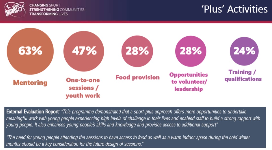 The project added further proof of the value and credibility of ‘doorstep sport’ – when delivered alongside so-called ‘sport plus’ services like mentoring, one-to-one support, volunteering, education and food – in preventing youth crime and serious violence.