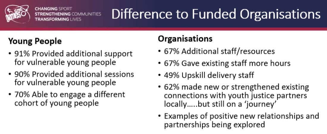 It supported 220 voluntary and community sport organisations (selected from 475 applications after 1,718 initial expressions of interest) who each received a share of the £5m fund to carry out targeted work with at-risk young people.